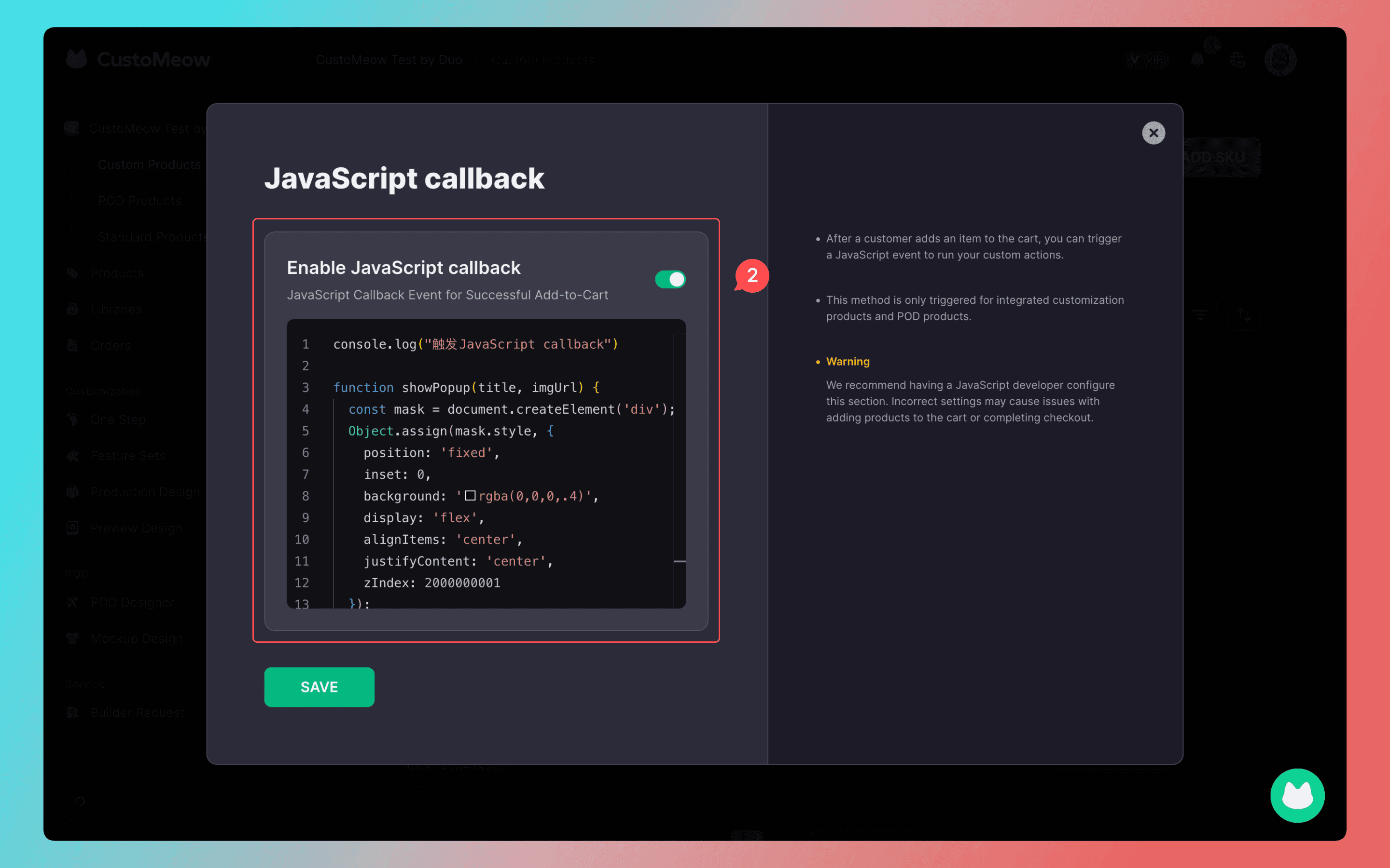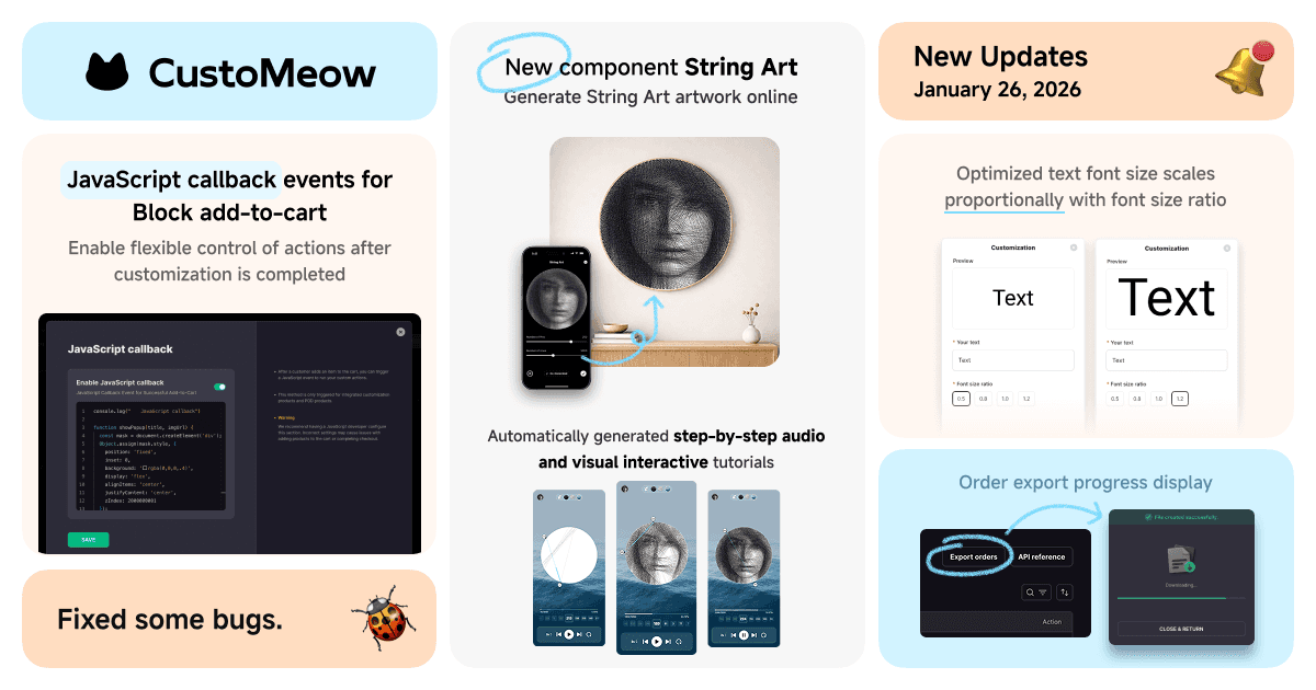 To meet the needs of merchants who want to control user actions after customization, this update adds support for custom JavaScript callback events.
