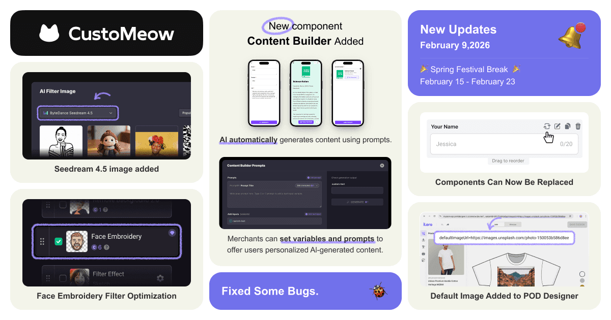 The CustoMeow team will be on break for the Chinese Spring Festival .Holiday period: February 15 – February 23, 2026