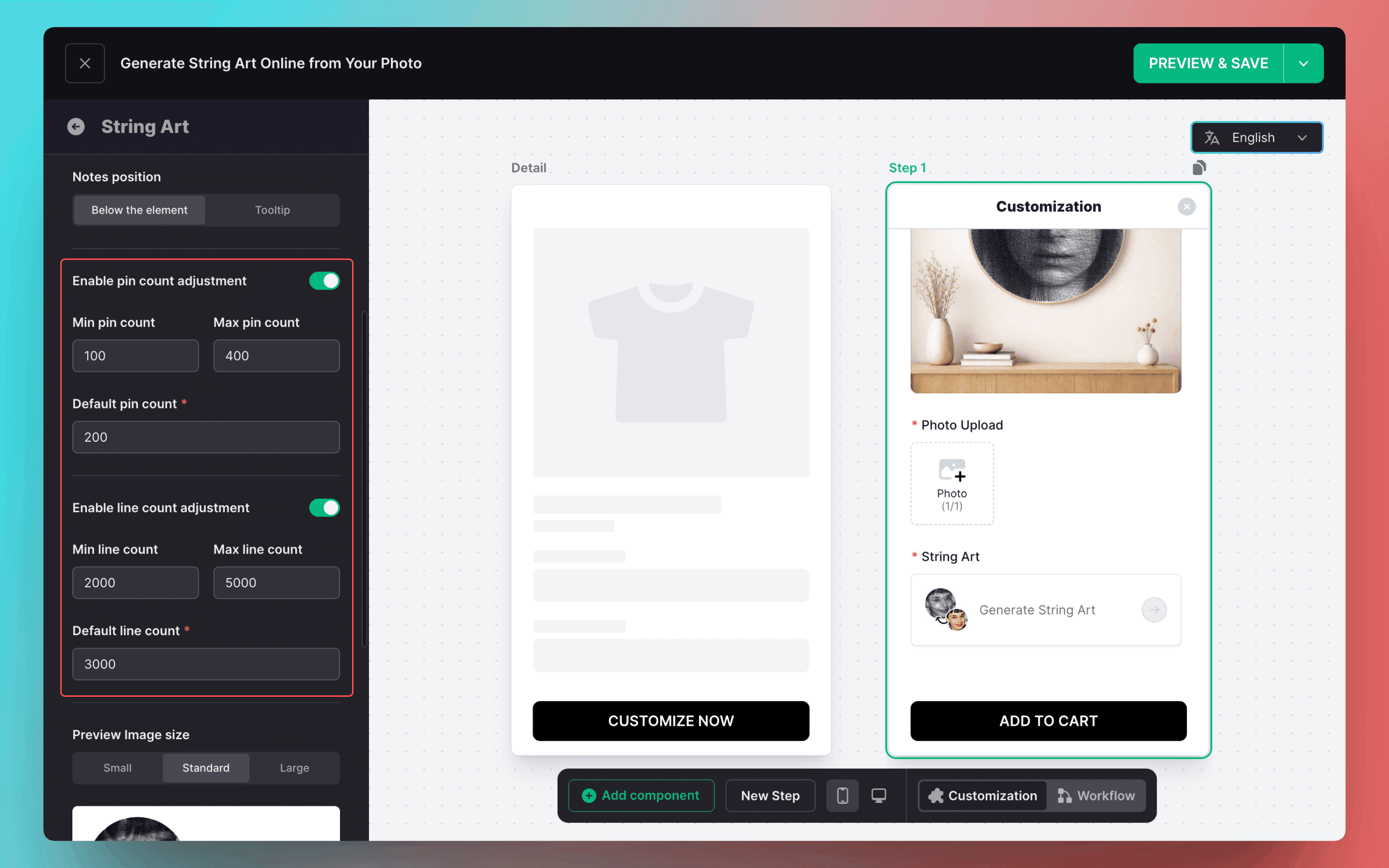 Configure the String Art generation parameters based on your product specifications, including the number of pins and number of lines.