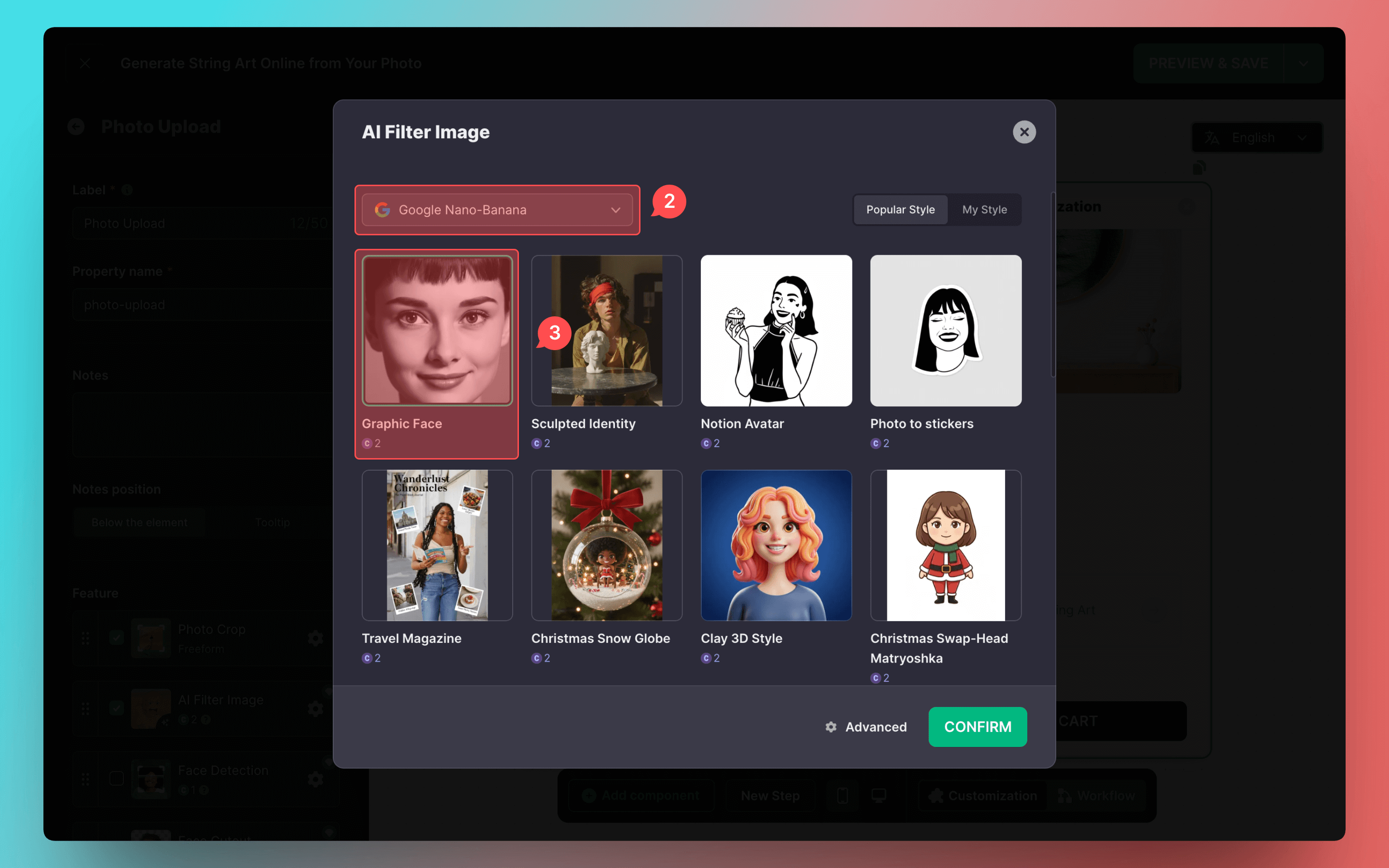 To achieve more stable String Art processing results, we recommend applying an AI filter to create a macro close-up, pure black-and-white image. We have calibrated and provided a matching AI filter solution based on the Google Nano-Banana model: Graphic Face.