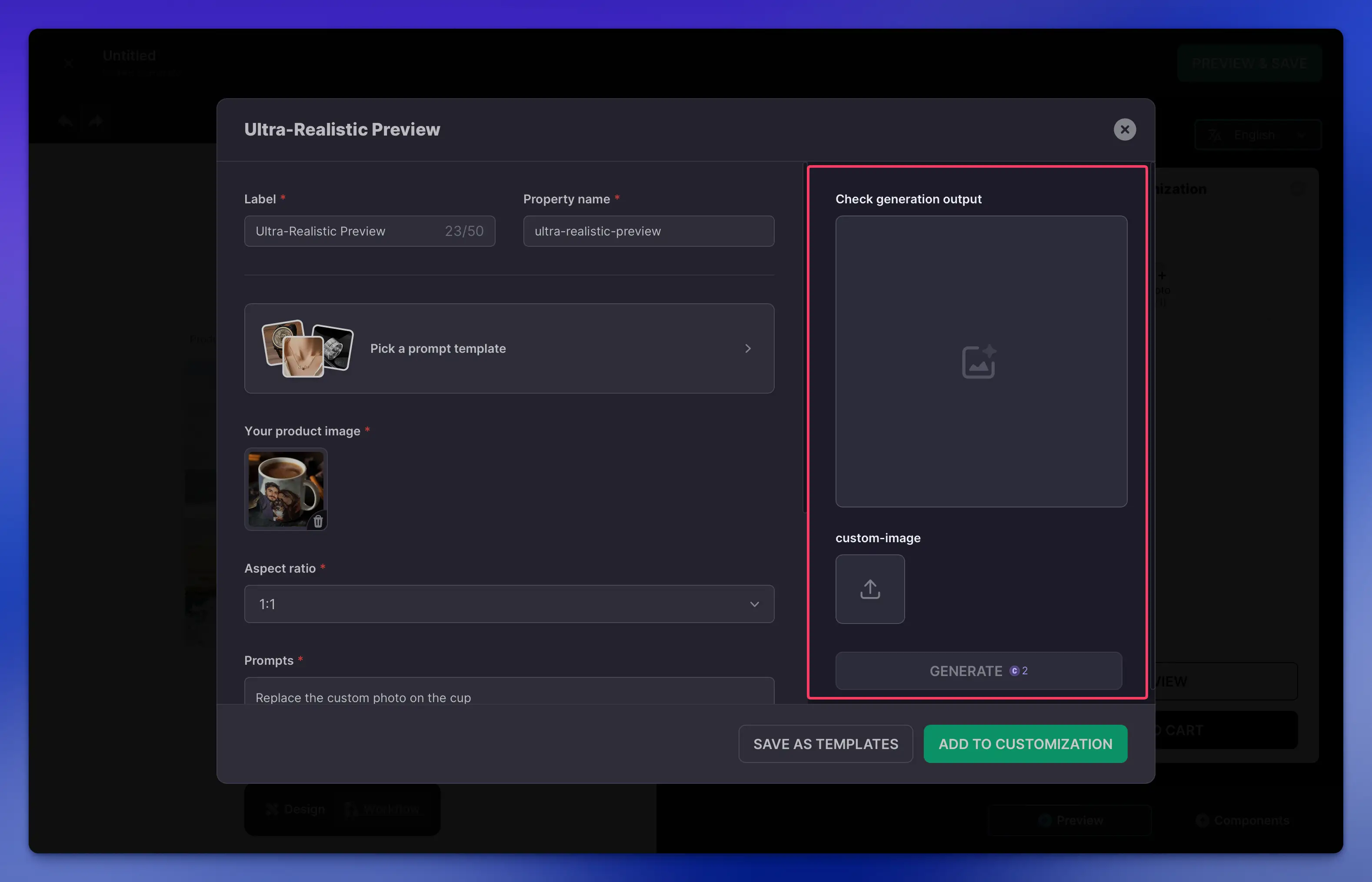A: 这主要源自于超逼真预览是基于 AI 图片模型生成的,它并不像其他预览组件,是基于数据渲染,所以考虑到任何组件数据的更新都不能主动更新超逼真预览,否则将产生无用的生成以及资源浪费,所以我们将其独立一个按钮,用户想看就看,不看也不影响购物流程。