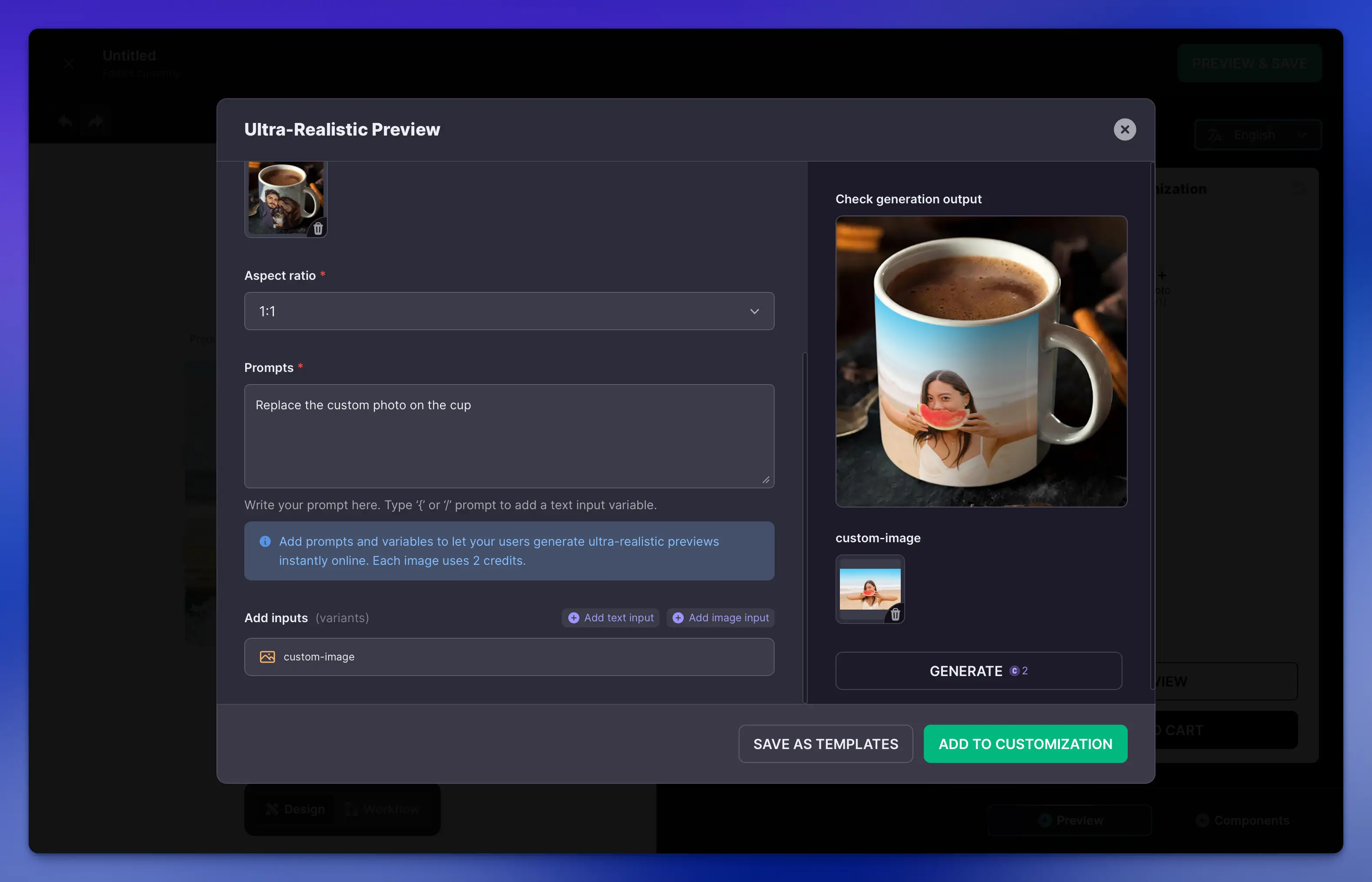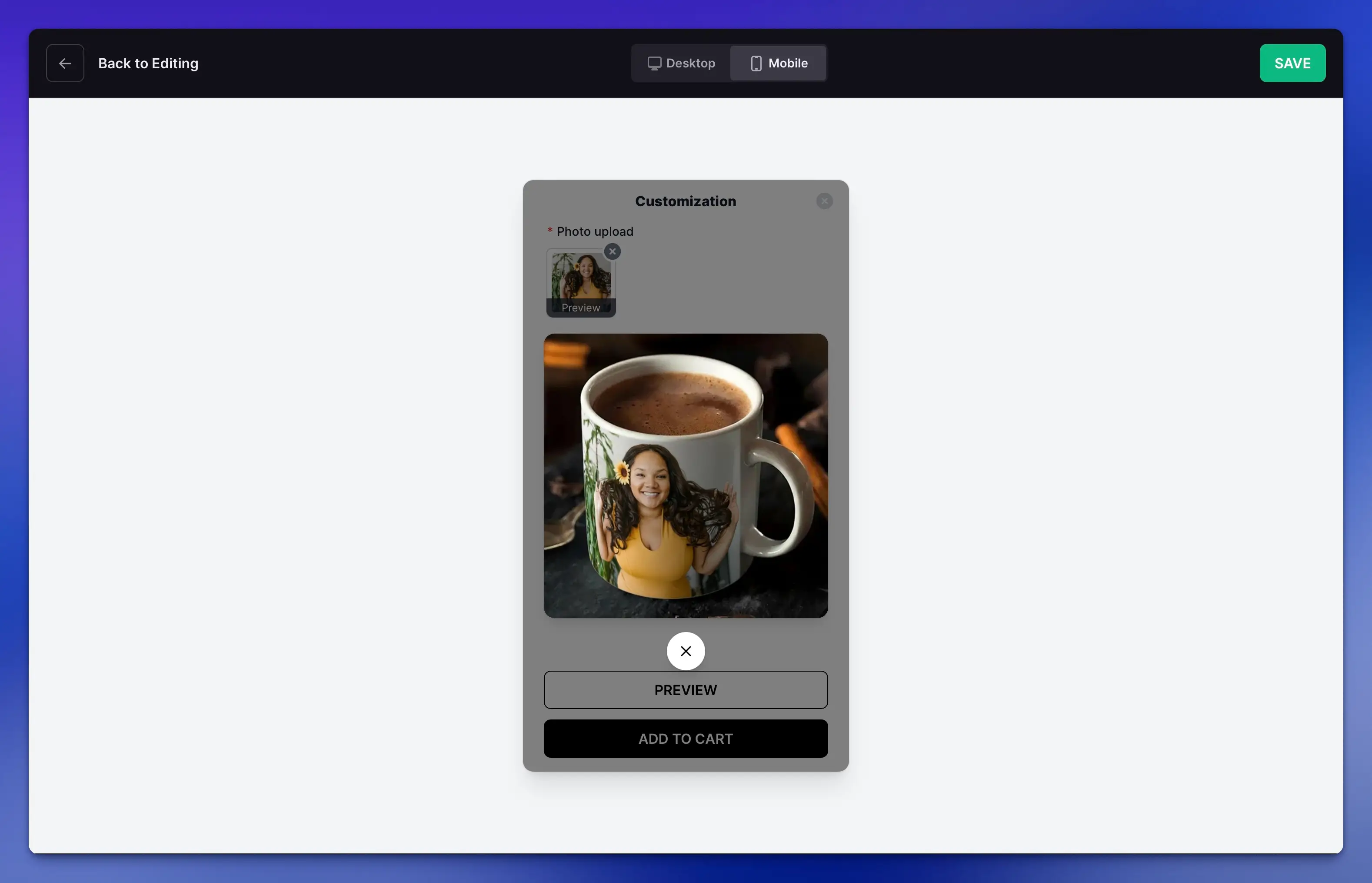 马克杯定制:你无需设计 Mockup,就能实现用户的照片贴到杯子上,并且非常真实。
