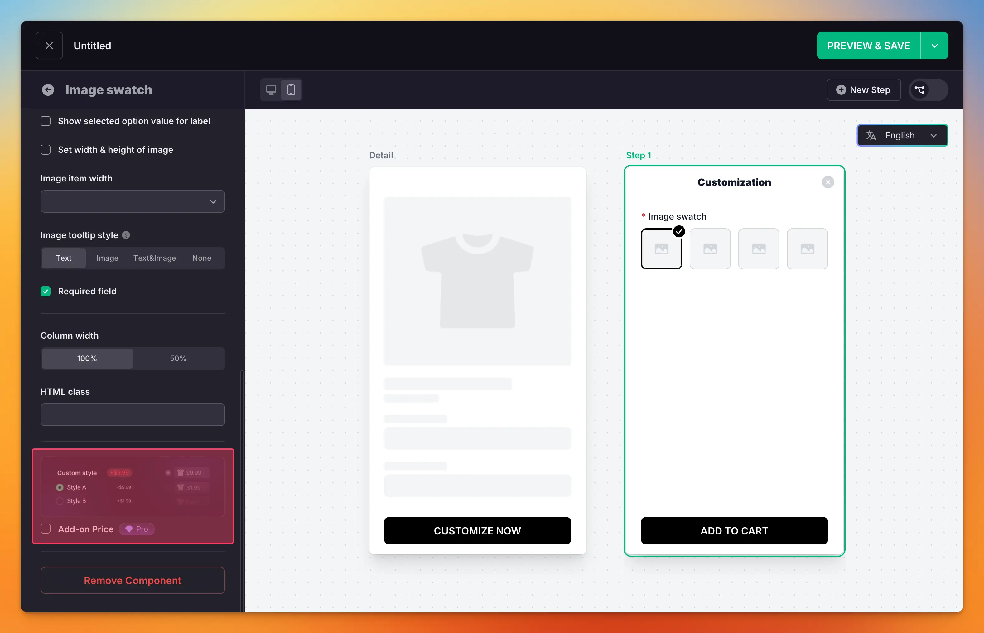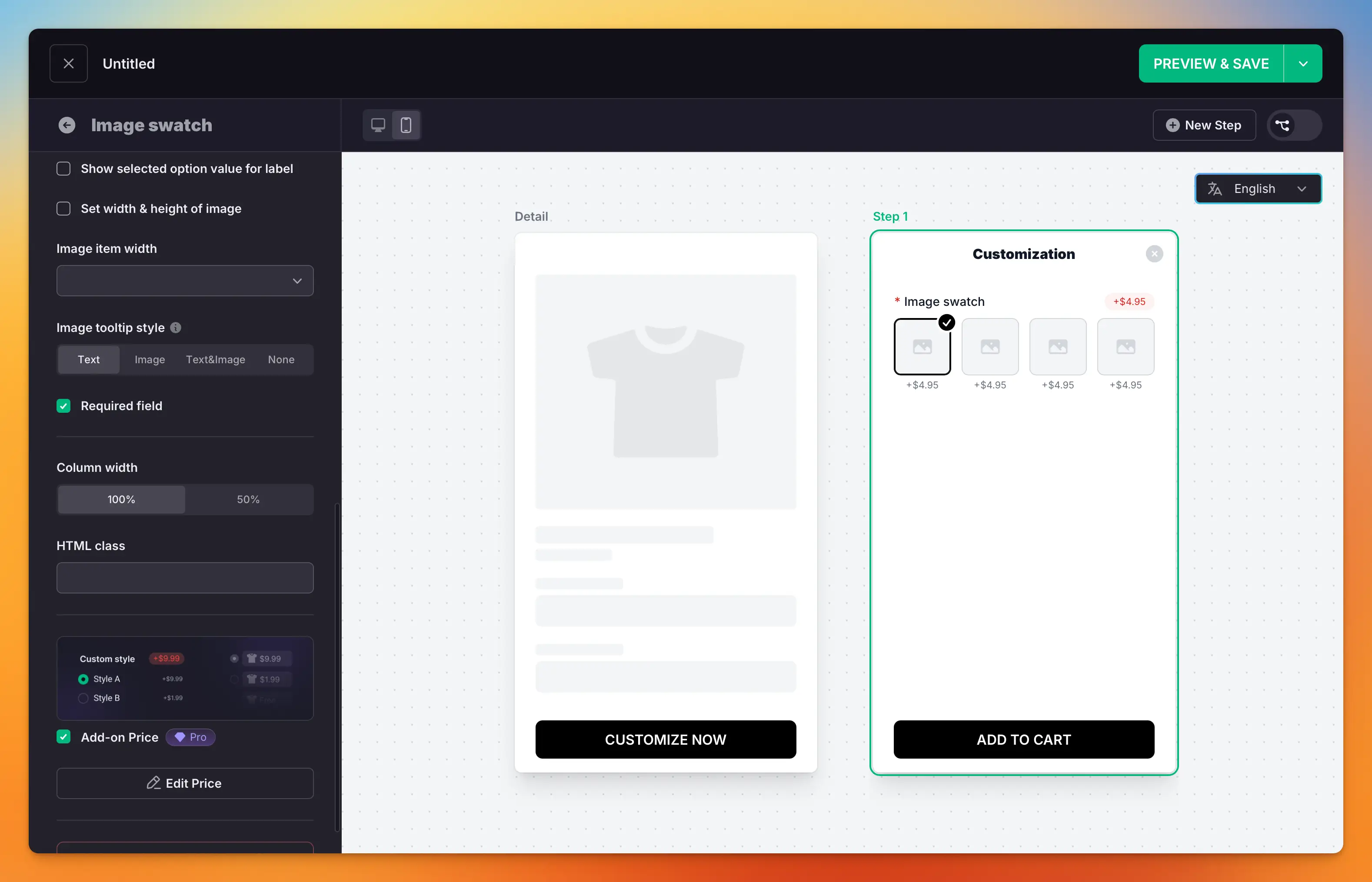 每个选项对应一个加价项。此处添加的标记产品来自您的产品库,当功能集成后,它们将自动发布到您的商店。